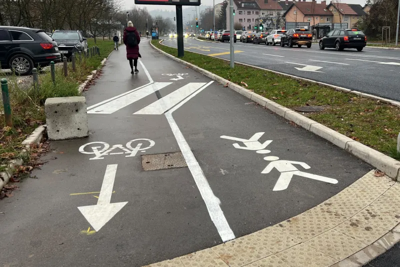Betonska kocka na kolesarski stezi sredi slovenske prestolnice pač ni nič nenavadnega. Prav tako zmedeno označevanje same kolesarske steze, prehodov za pešče ... Kot pravi sogovrnica predsednica društva Ljubljanska kolesarska mreža Lea Rikato Ružić, so se odgovorni šele nakdano lotili urejevanje prometa tudi za kolesarje. Foto: Uredništvo