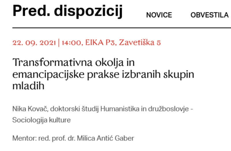 Toda javne objave na strani fakultete iz tistega časa kažejo drugače. Če je bil sklep o prehodu res sprejet junija 2021, zakaj je imela tri mesece za tem (22. 09. 2021) predstavitev dispozicije še vedno na področju sociologija kulture pri mentorici dr. Milici Antić Gaber?