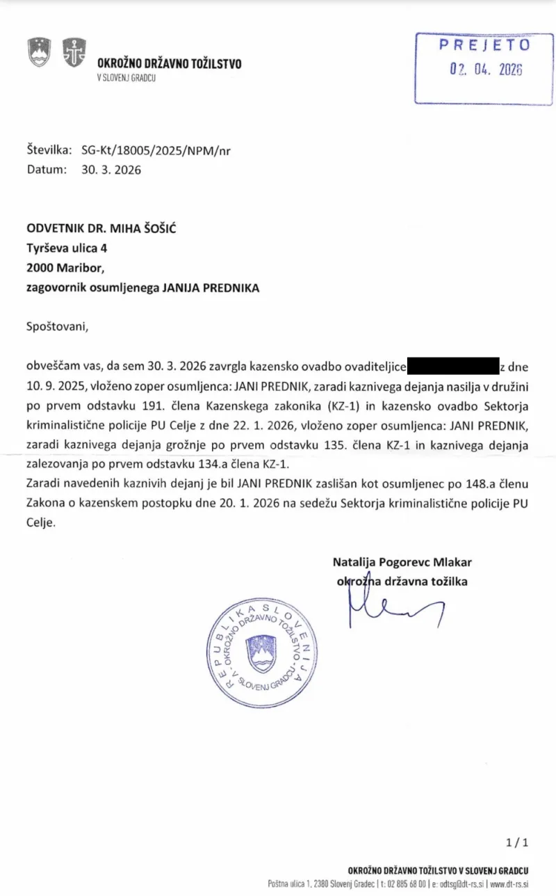 Okrožno državno tožilstvo je zavrglo kazensko ovadbo zoper nekdanjega poslanca SD Janija Prednika, ki jo je septembra lani zoper njega zaradi kaznivega dejanja nasilja v družini vložila njegova nekdanja partnerica. Po naših informacijah je okrožna državna tožilka zavrgla tudi kazensko ovadbo sektorja kriminalistične policije zaradi grožnje in kaznivega dejanja zalezovanja, ki je bila vložena zoper Prednika januarja letos.
