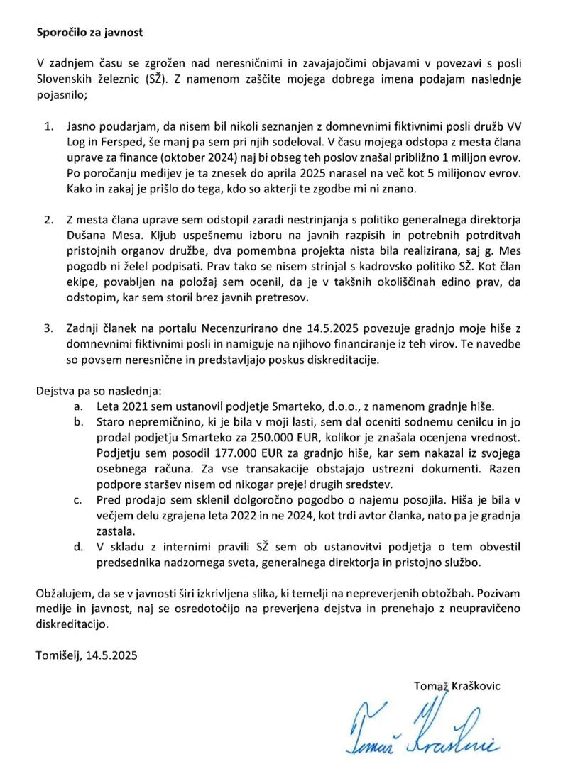 »Kot sem že pojasnil septembra 2024, sem prve posle sklenil po izrecnem navodilu Tomaža Kraškovica. Tomaž Kraškovic je nad mano vršil znatne pritiske in me prepričeval, da moram zaradi interesa skupine Slovenske železnice podpisati dokumentacijo v zvezi s spornimi posli, po podpisu pa dokumentacijo uničiti, kar sem tudi storil. Tomaž Kraškovic me je v zvezi s tem tudi prepričeval, da je sklepanje tovrstnih poslov usklajeno z Dušanom Mesom, generalnim direktorjem. Tomaž Kraškovic me je nenehno klical in name pritiskal do te mere, da sem dokumentacijo v prepričanju, da je to v interesu skupine Slovenskih železnic, podpisal. Pri tem se nisem zavedal, za kakšne posle gre. O spornih poslih nisem, do priznanja v mesecu septembru 2024, nikoli komuniciral z nikomer iz skupine SŽ, razen s Tomažem Kraškovicem.