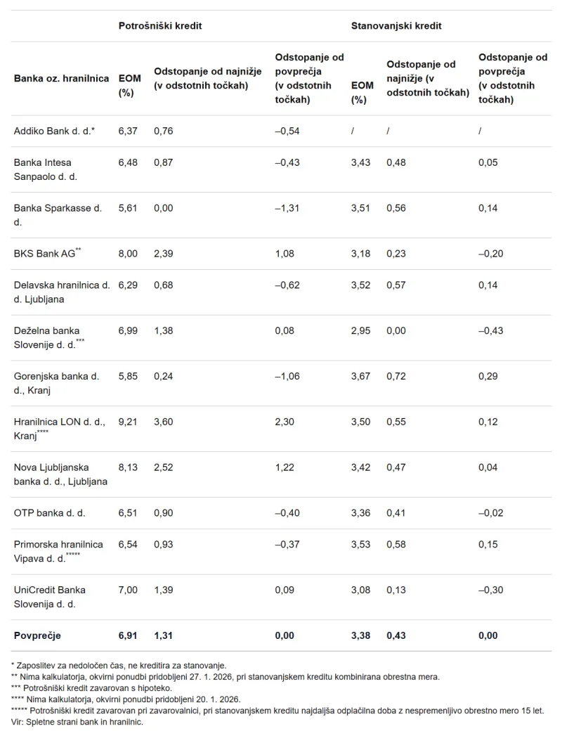 Pri Banki Slovenije so tudi analizirali strošek kreditov za prebivalstvo. Povprečna oglaševana efektivna obrestna mera v primeru potrošniškega kredita je lani znašala 6,91 odstotka, v primeru stanovanjskega pa 3,38 odstotka. Pri tem ostajajo relativno velike razlike med ponudbami bank. Tako razlika med najvišjo in najnižjo EOM v primeru povprečnega potrošniškega kredita znaša 3,60 odstotne točke, v primeru stanovanjskega kredita pa 0,72 odstotne točke.