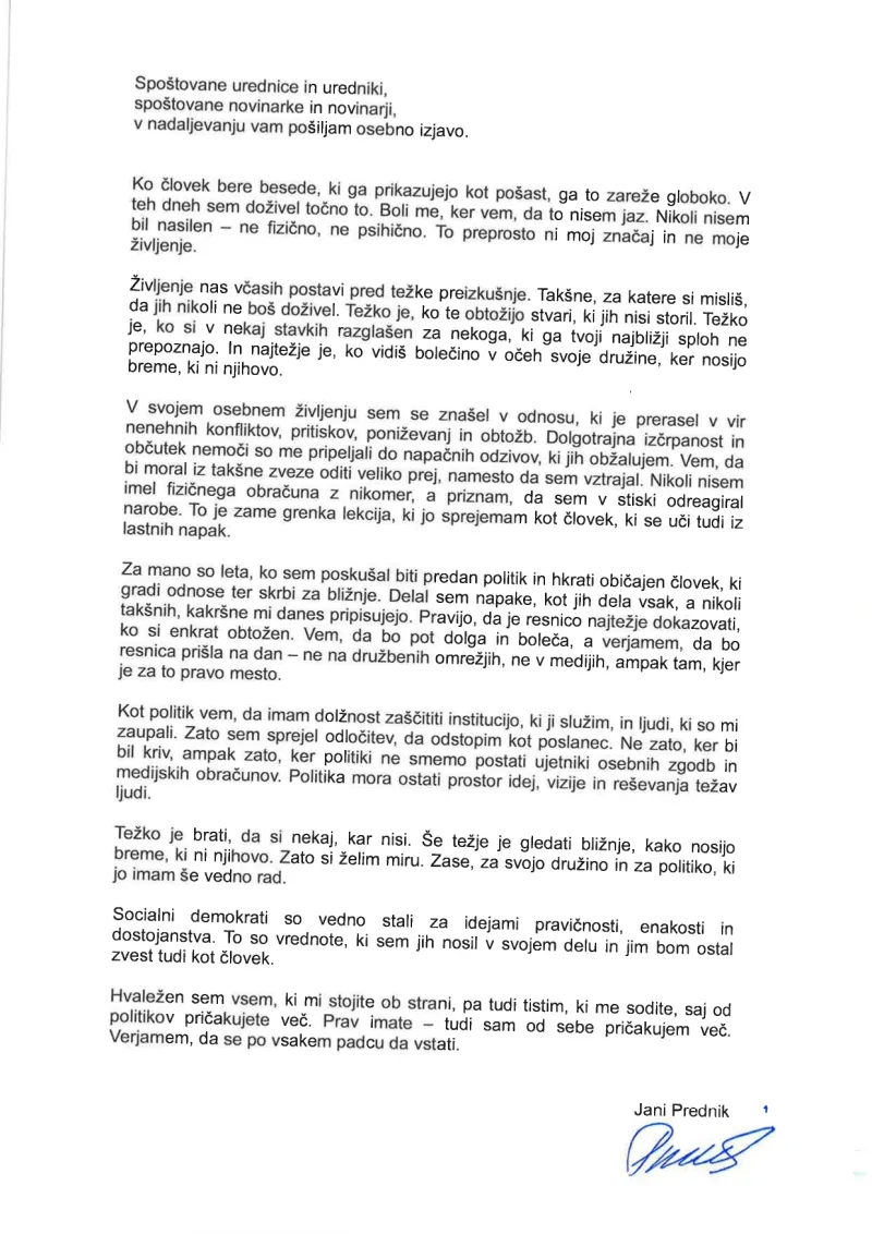 V nadaljevanju objavljamo izjavo Janija Prednika: