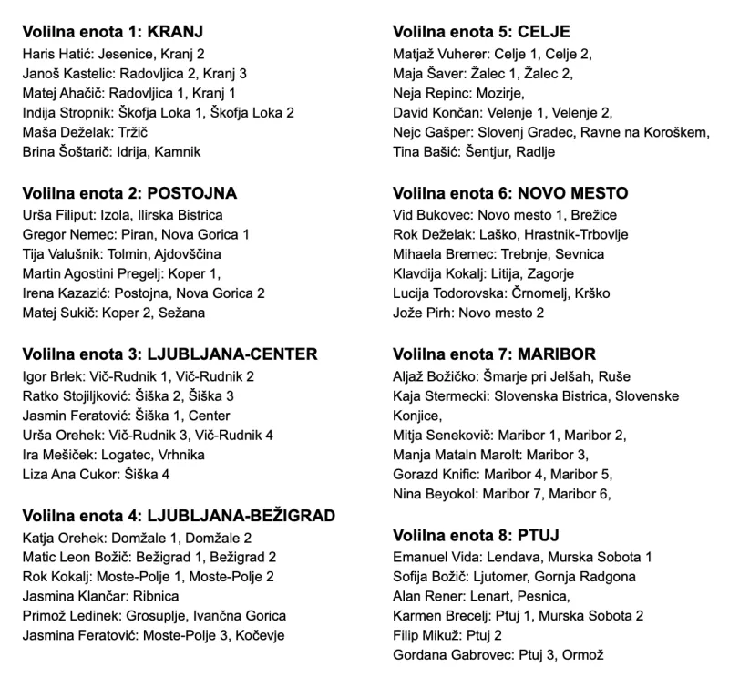 Vsako od osem volilnih enot so popolnili s šestimi kandidati. Katerimi, si lahko ogledate spodaj.