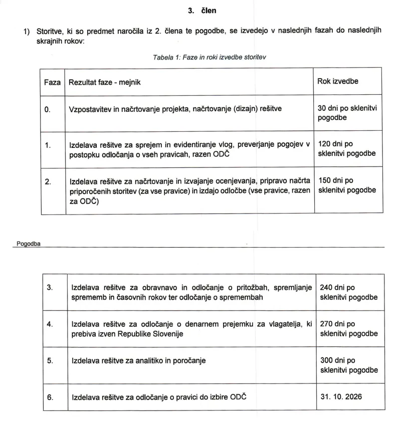 V pogodbi je določenih sedem faz in rokov izvedbe (posnetek spodaj). Po časovnici bi jih moralo biti do 24. decembra 2025 zaključenih pet, a ni še nobena.