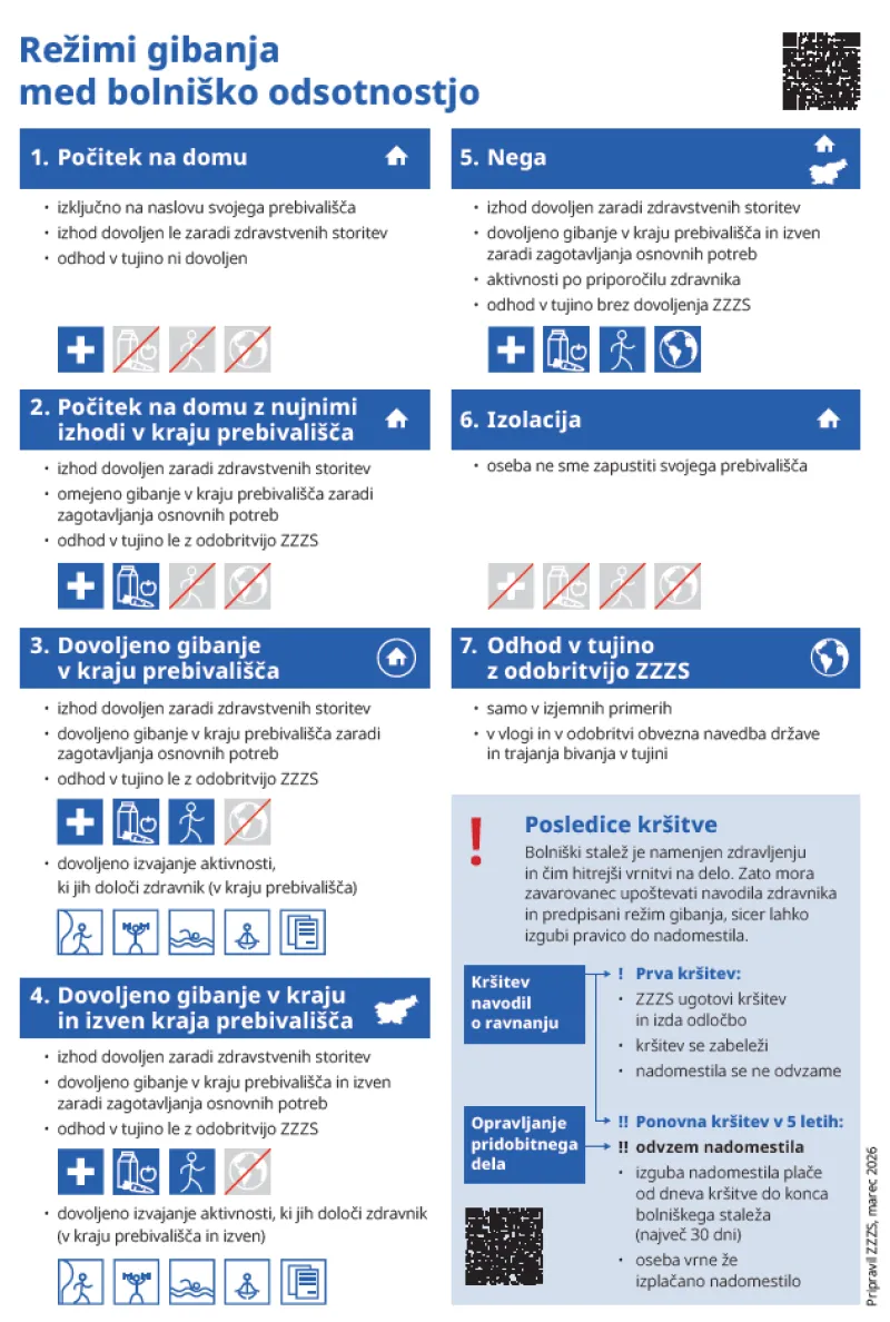 Zakon o dodatnih interventnih ukrepih na področju zdravstva (ZDIUPZ), ki je začel veljati 1. januarja letos, je prinesel novosti glede bolniških odsotnosti, ki predvidevajo pisna navodila o ravnanju in tudi sankcije ob njihovi kršitvi. Pisna navodila, s katerimi morajo biti seznanjeni zavarovanci in njihovi delodajalci, zdaj predvidevajo 7 režimov gibanja, ki se razlikujejo glede na območje, kjer se zavarovanec oz. pacient lahko giblje, in glede na aktivnosti, ki jih lahko izvaja.